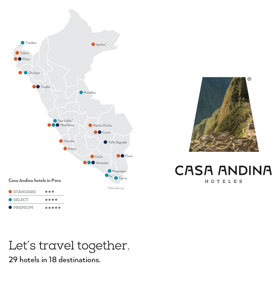 Casa Andina puts special emphasis on Andean culture through its two brands: Casa Andina Classic and Casa Andina Private Collection. The first comprises twelve comfortable hotels located in the main tourist destinations of Southern Peru. The second includes seven exclusive hotels in the most impressive settings of the Andean region,. Built in harmony with the surroundings, both brands offer the highest standards of comfort and service.